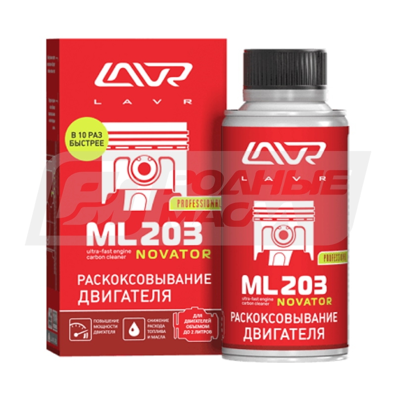 Раскоксовка двигателя ML203 NOVATOR – усиленный состав на базе классической формулы LAVR для быстрой и эффек­тивной очистки поршней, компрессионных и мас­лосъемных колец от стойких смолисто-коксовых и нагарных отложений. Продукт рекомендован к применению при симптомах понижения мощности, ухудшения приемистости и динамики, дымности, большого перерасхода масла, в автомобилях с большим пробегом или тех, которые постоянно эксплуатируются в городских условиях. Благодаря высокой проникающей способности ML203 за один час размягчает и выводит загрязнения, затрудняющие работу двигателя, благодаря чему нормализуется расход масла, выравнивается компрессия в цилиндрах, восстанавливаются тягово-скоростные характеристики двигателя. Состав безопасен для краски поддона картера при соблюдении инструкции. Рекомендован в том числе для автомобилей с большим пробегом.